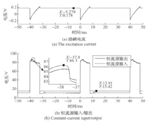 由圖7曲線結(jié)合圖2可知,在勵(lì)磁方向切換后,檢流電路檢測(cè)到的圖7(a)中的勵(lì)磁電流瞬間為負(fù),此時(shí)勵(lì)磁線圈處于電能泄放狀態(tài)并向能量反饋電路中的儲(chǔ)能電容充電。由于儲(chǔ)能電容充電,高、低壓切換電路的輸出電壓從80V逐漸升高;待勵(lì)磁線圈能量泄放完即勵(lì)磁電流為零時(shí),儲(chǔ)能電容兩端電壓達(dá)到*高86V并開始放電,勵(lì)磁電流開始上升;儲(chǔ)能電容電壓降低至80V時(shí),高低壓切換電路趨于80V的穩(wěn)定輸出狀態(tài),此時(shí)勵(lì)磁電流繼續(xù)上升;待勵(lì)磁電流上升至設(shè)定的超調(diào)量205 mA后,遲滯比較電路控制高低壓切換電路切換至17V低壓源作為勵(lì)磁工作電源,恒流電路在17V低壓源輸入下進(jìn)行恒流控制輸出。