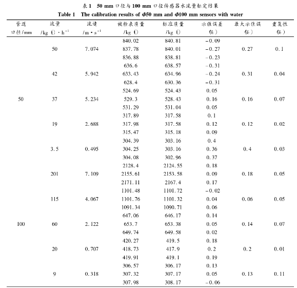 為了評(píng)測(cè)系統(tǒng)的實(shí)際應(yīng)用效果,進(jìn)行了水流量標(biāo)定實(shí)驗(yàn)。分別針對(duì)50mm口徑與100mm口徑的傳感器進(jìn)行標(biāo)定。系統(tǒng)勵(lì)磁方式采用方波勵(lì)磁,勵(lì)磁頻率為12.5Hz,管道*大流速為7m/s左右,*小流速為0.3 m/s左右,標(biāo)定結(jié)果如表1所示。