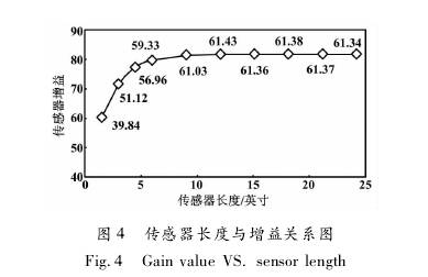 采用一臺(tái)日徑為6英寸、標(biāo)準(zhǔn)線圈的傳感器,改變傳感器長度,依次進(jìn)行試驗(yàn)室標(biāo)定試驗(yàn)。傳感器長度與增益的關(guān)系圖如圖4所示。當(dāng)傳感器長度為9. 1英寸時(shí),其增益為61. 03;但當(dāng)其長度繼續(xù)增加時(shí),增益變化較小;當(dāng)其長度6. 1英寸減小到0時(shí),增益從59. 33開始下降。也就是說,當(dāng)傳感器長度為6. 1-9. 1英寸時(shí),既有效利用了線圈產(chǎn)生的磁場,又可使傳感器長度較短。