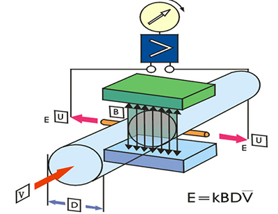 當導電液體沿測量管在交變磁場與磁力線成垂直方向運動時,導電液體切割磁力線產生感應電勢。在與測量管軸線和磁力線相互垂直的管壁上安裝了一對檢測電極,將這個感應電勢檢出。