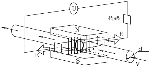 如圖,測量流量時(shí),流體流過垂直于流動(dòng)方向的磁場,導(dǎo)電性流體的流動(dòng)感應(yīng)出一個(gè)與平均流速成正比的電勢。其感應(yīng)電壓信號通過兩個(gè)電極檢出,并通過電纜傳送至轉(zhuǎn)換器,經(jīng)過信號處理及相關(guān)運(yùn)算后,將累計(jì)流量和瞬時(shí)流量顯示在轉(zhuǎn)換器的顯示屏上。