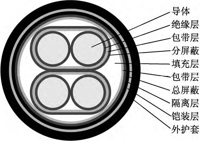 該新型電纜的結(jié)構(gòu)如圖1所示。導(dǎo)體為單股退火鍍錫軟銅線,以提高導(dǎo)體的導(dǎo)電性和防腐蝕性。在導(dǎo)體外繞包一層?。疲矗ň鬯姆蚁┌雽?dǎo)電帶,有利于降低導(dǎo)體和絕緣之間的摩擦起電噪音。絕緣采用材料較為純凈、介電常數(shù)較小、具有一定彈性的聚丙烯絕緣級材料,并采用擠壓式擠出,減小絕緣層與導(dǎo)體的間隙。采用對絞組作為信號傳輸線,由于在兩根傳輸線上感應(yīng)的電壓接近相等,減小了電壓差值,提高了信號傳輸穩(wěn)定性;對絞組由兩種不同顏色絕緣線芯組成,相鄰線對對絞節(jié)距應(yīng)不大于100mm。對絞分屏蔽組(即對對絞組進(jìn)行分屏蔽,每對對絞組外繞包兩層聚酯帶和一層厚0.04mm鋁塑復(fù)合帶繞包,內(nèi)置一根7×0.26mm鍍錫銅絞線作引流線)有利于對不同對絞組之間信號串音的抑制和隔離。對絞分屏蔽組同心式絞合成纜,在對絞分屏蔽組間填充非吸濕性材料,以保證纜芯圓整。在成纜纜芯外繞包兩層聚酯帶,再采用鋁塑復(fù)合帶繞包,內(nèi)置鍍錫銅線作引流線,以提高電纜電磁屏蔽能力??偲帘螌油鈹D包隔離層(隔離護(hù)套),隔離層采用絕緣級低密度聚乙烯材料。隔離層外采用鎧裝層,鎧裝材料為高導(dǎo)磁合金鋼帶,其為強(qiáng)磁材料,可將外來的磁通大部分限制在鎧裝層的外表面上(僅有少部分能進(jìn)入被屏蔽的空間);鎧裝時對高導(dǎo)磁合金鋼帶采用縱包焊接,確保其形成一連續(xù)圓柱管;鎧裝層可提高電纜抗電磁干擾水平以及對電纜進(jìn)行加強(qiáng),減少電纜振動引起的電動勢。外護(hù)套采用藍(lán)色軟PVC(聚氯乙烯)護(hù)層級電纜材料擠包,實現(xiàn)電纜防護(hù)。