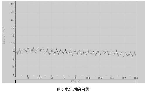 圖4、圖5中所示曲線為測(cè)量過程中所截取的集流傘中所聚集的氣相,通過排氣通道排出時(shí)與排出后的測(cè)量曲線。測(cè)試過程中錄取到的儀器排氣的過程,當(dāng)集流傘完全支開后仍需要開啟流量測(cè)試進(jìn)行實(shí)時(shí)檢測(cè),否則可能會(huì)錄取資料失真。