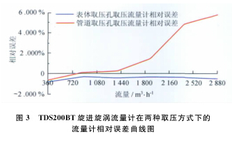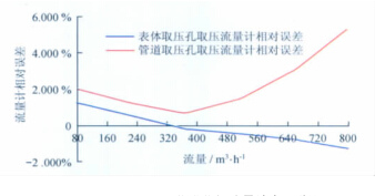 從以上數(shù)據表和曲線圖中可以看出:天燃氣流量計型號一定的情況下,用表體取壓孔取壓方式檢定流量計時流量計的線性度較好,用管道取壓孔取壓方式檢定流量計時流量計的線性度較差;流量測點相同的情況下,表體取壓孔取壓檢定方式的流量計誤差較小,管道取壓孔取壓檢定方式的流量計誤差較大;兩種取壓方式引起的誤差隨著流量的增大而逐漸增大,在流量為2 900m3/h時兩者相差近6.2%,遠遠超出了流量計的準確度等級。所以,在天燃氣流量計的檢定過程中,應避免在流量計表體取壓孔以外的地方取壓進行檢定。