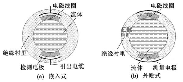 電極與被測流體通過絕緣管形成檢測電容,通過此電容來藕合流量信號。其主要的結(jié)構(gòu)形式按照電極的安裝位置可以分為兩種:電極嵌人測量管的絕緣襯里內(nèi)部(嵌人式)、電極貼在測量管外部(外貼式)。嵌入式結(jié)構(gòu)與普通管道式電磁流量計結(jié)構(gòu)相似,而外貼式大多是通過陶瓷表面金屬化技術(shù)將電極貼在測量管外。