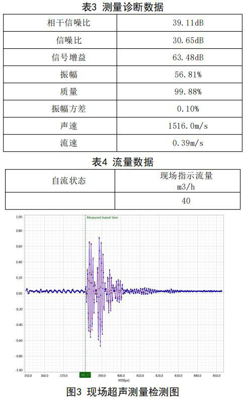在機組自流補給水狀態(tài):同樣采用德國FLUEX 高精度外夾式超聲波流量計作為標準流量計,測量 基礎(chǔ)數(shù)據(jù):管道外徑276.93mm,管壁厚度12.40mm, 采用兩聲程169mm傳感器安裝距離,通過對超聲波流量計信號分析與診斷(數(shù)據(jù)見表3和表4),超聲 波流量計測量狀態(tài)符合條件,開始測量,打開凝汽 器入口閥門,流量測量情況如下