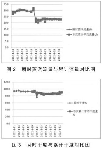 根據(jù)錐型孔板流量計(jì)在稠油 SAGD 的應(yīng)用數(shù)據(jù),將瞬時(shí)蒸汽流量與累計(jì)平均流量、瞬時(shí)干度與累計(jì)平均干度、瞬時(shí)蒸汽流量與鍋爐流量、累計(jì)平均流量與鍋爐流量、瞬時(shí)干度與鍋爐干度、累計(jì)平均干度與鍋爐干度、瞬時(shí)流量誤差與累計(jì)流量誤差、瞬時(shí)干度誤差與累計(jì)平均干度誤差繪成散點(diǎn)圖(圖 2 - 圖 5)。