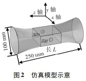 使用 Pro /E 軟件建立三維幾何模型,導(dǎo)入 COMSOL 軟件進(jìn)行有限元求解。仿真模型如圖 2 所示,電極連線為x 軸,連線中點(diǎn)為坐標(biāo)原點(diǎn),流體運(yùn)動(dòng)方向?yàn)?z 軸,傳感器管道口徑為 DN100,總長(zhǎng)250 mm。異徑管部分初始結(jié)構(gòu)尺寸 L = 80 mm,D = 80 mm,H = 40 mm,圓形電極半徑為17 mm,伸出絕緣襯里的*大距離為 1. 5 mm。