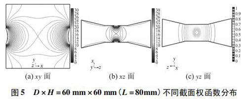 4) 圖 3( c) 、圖 4( c) 的 yz 面權(quán)函數(shù)分布表明,D = 90 mm時(shí)的權(quán)函數(shù)等勢(shì)線間距略大于 D = 60 mm 時(shí)的權(quán)函數(shù)等勢(shì)線間距,權(quán)函數(shù)變化梯度較小,且中心區(qū)域的權(quán)函數(shù)等勢(shì)線逐漸變?yōu)橹本€,因此 D = 90 mm 的權(quán)函數(shù)分布更均勻一些,但是兩者區(qū)別很小,即寬度改變對(duì) yz 面權(quán)函數(shù)分布影響很小。圖 4( c) 、圖 5( c) 的 yz 面權(quán)函數(shù)分布表明,H = 30 mm時(shí)的權(quán)函數(shù)等勢(shì)線間距較大,且中心區(qū)域的權(quán)函數(shù)等勢(shì)線逐漸變?yōu)橹本€,因此 H = 30 mm 的權(quán)函數(shù)分布更加均勻;