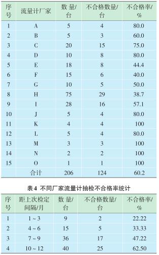 主要分析了油田內(nèi)常用廠家產(chǎn)品的檢定合格率,各廠家流量計(jì)檢定合格率對比見表3。從表3中可以看出:氣體流量計(jì)周期內(nèi)誤差超差概率偏大,總體達(dá)60%。