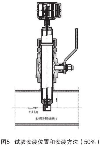 對(duì)插入式壓縮空氣流量計(jì)和插入式電磁流量計(jì)的結(jié)構(gòu)原理進(jìn)行分析,插入式電磁流量計(jì)的信號(hào)采集點(diǎn)在標(biāo)校管道內(nèi)12.5% 為宜,因它屬電磁類流量計(jì),而壓縮空氣流量計(jì)是根據(jù)“卡門渦街”原理進(jìn)行測(cè)量管道內(nèi)流量,根據(jù)標(biāo)校管道內(nèi)層流和湍流的分析,以及插入式壓縮空氣流量計(jì)獨(dú)特的探頭結(jié)構(gòu)形式,確定插入式壓縮空氣流量計(jì)的插入深度為標(biāo)校管道內(nèi) 50%,試驗(yàn)安裝位置和安裝方法如圖 5 所示。