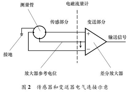 液體流量計主要由兩部分組成:流量傳感器和信號變送器,如圖 2 所示。傳感器上的勵磁線圈接受變送器傳輸來的勵磁電流產(chǎn)生磁場,輸出感應電動勢信號;信號變送器則將感應電動勢信號轉(zhuǎn)換為流量信號或模擬量信號送至控制系統(tǒng)。液體流量計按組成方式分為一體式和分體式。液體流量計穩(wěn)定工作另外一個重要條件是接地。當流體流動穿過磁場時,以導電流體本身作為參考電位,在測量管一側(cè)電極產(chǎn)生正電勢,另一側(cè)產(chǎn)生負電勢,形成電勢差。但此電動勢信號一般只有幾毫伏,易受外界干擾。為防止干擾,將參考電位接入大地作為零電位,保證傳感器輸出精確穩(wěn)定的信號。傳感器和轉(zhuǎn)換器的接地端必須與被測介質(zhì)同電位,才能構(gòu)成對稱的輸入輸出回路。