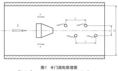 煙氣流量計(jì)實(shí)現(xiàn)流量測(cè)量的理論基礎(chǔ)是流體力學(xué)中**的“卡門(mén)渦街”原理,在流動(dòng)的流體中裝置一個(gè)非線(xiàn)性三角柱形體,即渦旋發(fā)生體,如圖 1 所示。當(dāng)流體沿渦旋發(fā)生體繞流時(shí),會(huì)在渦旋發(fā)生體下游產(chǎn)生兩列不對(duì)稱(chēng),但有規(guī)律交替地分離釋放出一系列漩渦束,只有當(dāng)兩渦漩列之間的距離 h 和同列的兩渦漩之間的距離 L 之比滿(mǎn)足 h/L=0.281 時(shí),所產(chǎn)生的渦街才是穩(wěn)定的。