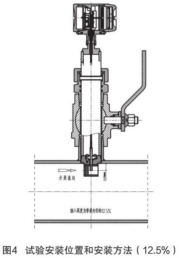 根據(jù)中華人民共和國(guó)機(jī)械行業(yè)標(biāo)準(zhǔn):JB/T9249-2015《流量計(jì)》進(jìn)行煙氣流量計(jì)的研制與設(shè)計(jì)。在試驗(yàn)過(guò)程中,因?yàn)槔碚撗芯坎怀浞?,再加上?jīng)驗(yàn)不足,采用插入深度是按照以往其它產(chǎn)品(插入式電磁流量計(jì))的經(jīng)驗(yàn),以插入深度為現(xiàn)場(chǎng)管道內(nèi)徑的 12.5% 進(jìn)行試驗(yàn),其對(duì)介質(zhì)流量的檢測(cè)值與同種規(guī)格管道法蘭式結(jié)構(gòu)的流量計(jì)進(jìn)行比較,偏差值較大、儀表準(zhǔn)確度無(wú)法滿(mǎn)足設(shè)計(jì)要求。試驗(yàn)安裝位置和安裝方法如圖 4 所示。