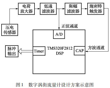 本文設(shè)計(jì)的基于 TMS320F2812 DSP 的數(shù)字鍋爐煙氣流量計(jì)的信號(hào)處理系統(tǒng)由前置放大電路和數(shù)字信號(hào)處理電路兩部分組成。本文選用的前置放大電路即為目前被廣泛應(yīng)用的普通流量計(jì)的前置放大電路,主要由電荷放大電路、低通濾波電路、限幅濾波電路和施密特觸發(fā)電路組成; 對(duì)于經(jīng)壓電傳感器測(cè)得的渦街信號(hào)采用了頻域分析和時(shí)域分析相結(jié)合的方式,即由前置放大電路和數(shù)字信號(hào)處理電路相配合。時(shí)域分析通道利用 DSP 事件管理器的捕獲模塊,對(duì)前置放大電路輸出的方波進(jìn)行頻率計(jì)算,然后再由 DSP 事件管理器通用定時(shí)器的比較輸出模塊進(jìn)行脈沖輸出。頻域分析通道即 DSP對(duì)低通濾波電路輸出的疊加了許多噪聲的正弦信號(hào)進(jìn)行 A/D 采樣,再利用 DSP 對(duì) A/D 采樣的結(jié)果進(jìn)行頻譜分析,從而得出此時(shí)渦街信號(hào)的頻率,*后由 DSP 通用定時(shí)器的比較輸出模塊進(jìn)行脈沖輸出。系統(tǒng)設(shè)計(jì)方案示意圖如圖 1 所示。
