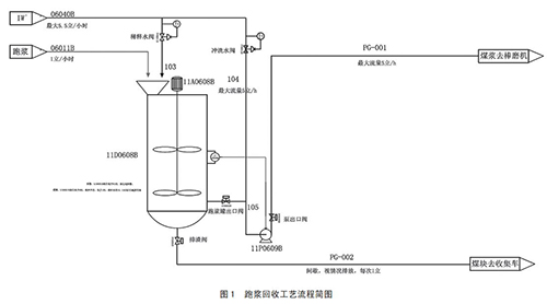 通過以上煤漿提濃通用方法優(yōu)缺點(diǎn)比較可以了解到,在現(xiàn)有設(shè)計(jì)條件基礎(chǔ)上,煤漿濃度提升會(huì)帶來一定設(shè)備損耗及能源損耗。針對這種情況,為了達(dá)到節(jié)能而保證實(shí)驗(yàn)室氣體流量計(jì)不跑漿,對于磨機(jī)跑漿問題進(jìn)行改善,對跑漿進(jìn)行回收,重新送回磨煤機(jī)進(jìn)行二次研磨,降低了實(shí)驗(yàn)室氣體流量計(jì)入口原料煤的粒度;同時(shí)降低了人員勞動(dòng)強(qiáng)度,改善了現(xiàn)場衛(wèi)生情況。具體跑漿回收裝置設(shè)計(jì)流程如圖 1 所示。
