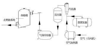 以原料萘為例。萘由原料儲(chǔ)罐經(jīng)液萘泵加壓后進(jìn)入萘蒸發(fā)器,液萘在萘蒸發(fā)器內(nèi)由中壓蒸汽加熱汽化分離,經(jīng)流量調(diào)節(jié)閥、流量計(jì)和氣萘切斷閥后進(jìn)入汽化器;空氣經(jīng)風(fēng)機(jī)加壓后,經(jīng)空氣加熱器加熱后進(jìn)入汽化器,氣萘和空氣在汽化器內(nèi)混合均勻后進(jìn)入氧化反應(yīng)器上部,經(jīng)催化床層發(fā)生氧化反應(yīng)生成苯酐和少量的副產(chǎn)物(以順酐、苯甲酸、萘醌、和鄰苯二甲酰亞胺為主);反應(yīng)氣體經(jīng)液體渦街流量計(jì)冷卻后再進(jìn)入切換冷凝器進(jìn)行凝華捕集,少量未被捕集的有機(jī)物和不凝氣體經(jīng)尾氣管路進(jìn)入蓄熱焚燒裝置焚燒處理,焚燒后的尾氣達(dá)標(biāo)排放。