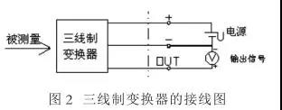 三線制變換器的接線圖如圖 2 所示,電流輸出系統(tǒng)除了兩根電流傳輸線以外,還有一根電源線向變壓器提供電源。三線制就是電源正端用一根線,信號(hào)輸出正端用一根線,電源負(fù)端和信號(hào)負(fù)端共用一根線。其供電大多為 DC 24V , 輸出信號(hào)有 DC4-20mA ,負(fù)載電阻為 250Ω 或者 DC0-10mA ,負(fù)載電阻為 0-1.5kΩ ;有的還有 mA 和 mV 信號(hào),但負(fù)載電阻或輸入電阻,因輸出電路形式不同而數(shù)值有所不同。