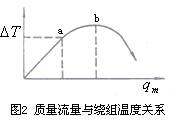 在總的熱傳導(dǎo)系數(shù)a中,因測(cè)量管壁很薄且具有相對(duì)較高熱導(dǎo)率,儀表制成后其值不變,因此a的變化可簡(jiǎn)化認(rèn)為主要是流體邊界層熱導(dǎo)率的變化。當(dāng)使用于某一特定范圍的流體時(shí),則a、cp均視為常量,則質(zhì)量流量?jī)H與繞組平均溫度差成正比,如圖2 oa 段所示。 oa段為儀表正常測(cè)量范圍,儀表出口處流體不帶走熱量,或者說(shuō)帶走熱量極微;超過(guò)a點(diǎn)流量增大到有部分熱量被帶走而呈現(xiàn)非線性,流量超過(guò)b點(diǎn)則大量熱量被帶走。