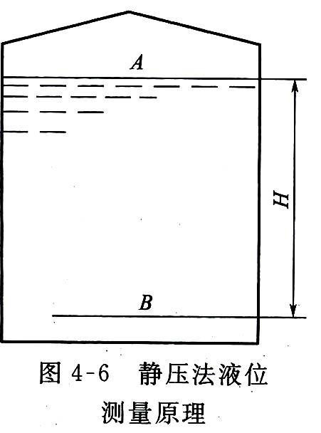 由式(4—8)和式(4—9)可知,液體任何一點(diǎn)的壓力等于其表面壓力加上液體密度與重力加速度及液柱高度的乘積。液體的靜壓力是液位高度和液體密度的函數(shù),當(dāng)液體的密度為常數(shù)時(shí),A、B圖4—6靜壓法液位測量原理兩點(diǎn)的壓力或壓差僅與液位高度有關(guān)。因此可以通過測量P或Ap來實(shí)現(xiàn)液位高度的測量。這樣液位高度的測量就變?yōu)橐后w的靜壓測量,凡是能夠測量壓力或壓差的儀表,只要量程合適均可用于液位測量。