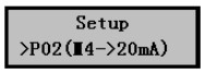 1)在儀表正常工作時按擊Mode鍵進入?yún)?shù)設(shè)置菜單后按擊▼鍵選擇P02(4~20mA)設(shè)置菜單,如右圖。