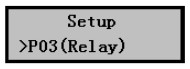 1) 在儀表正常工作時按擊Mode鍵進入?yún)?shù)設(shè)置菜單后按擊▼鍵選擇到P03(Relay)繼電器設(shè)置菜單,如右圖所示。