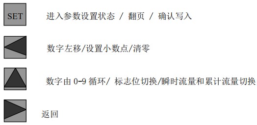 設置小數(shù)點:直接按 SET 鍵確認,進入默認流量參數(shù)設置菜單,顯示屏顯示 QP,按數(shù)字↑ 鍵設置標志位。按數(shù)字← 鍵設置小數(shù)點,按→鍵可以返回菜單選擇項。